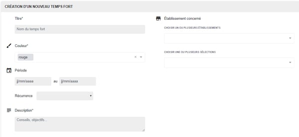 Pour ajouter un temps fort dans le calendrier, il vous suffit de cliquer sur le bouton Ajouter un temps fort. Vous pouvez ensuite compléter les données de ce temps fort comme vous le souhaitez dans la fenêtre qui s’affiche.